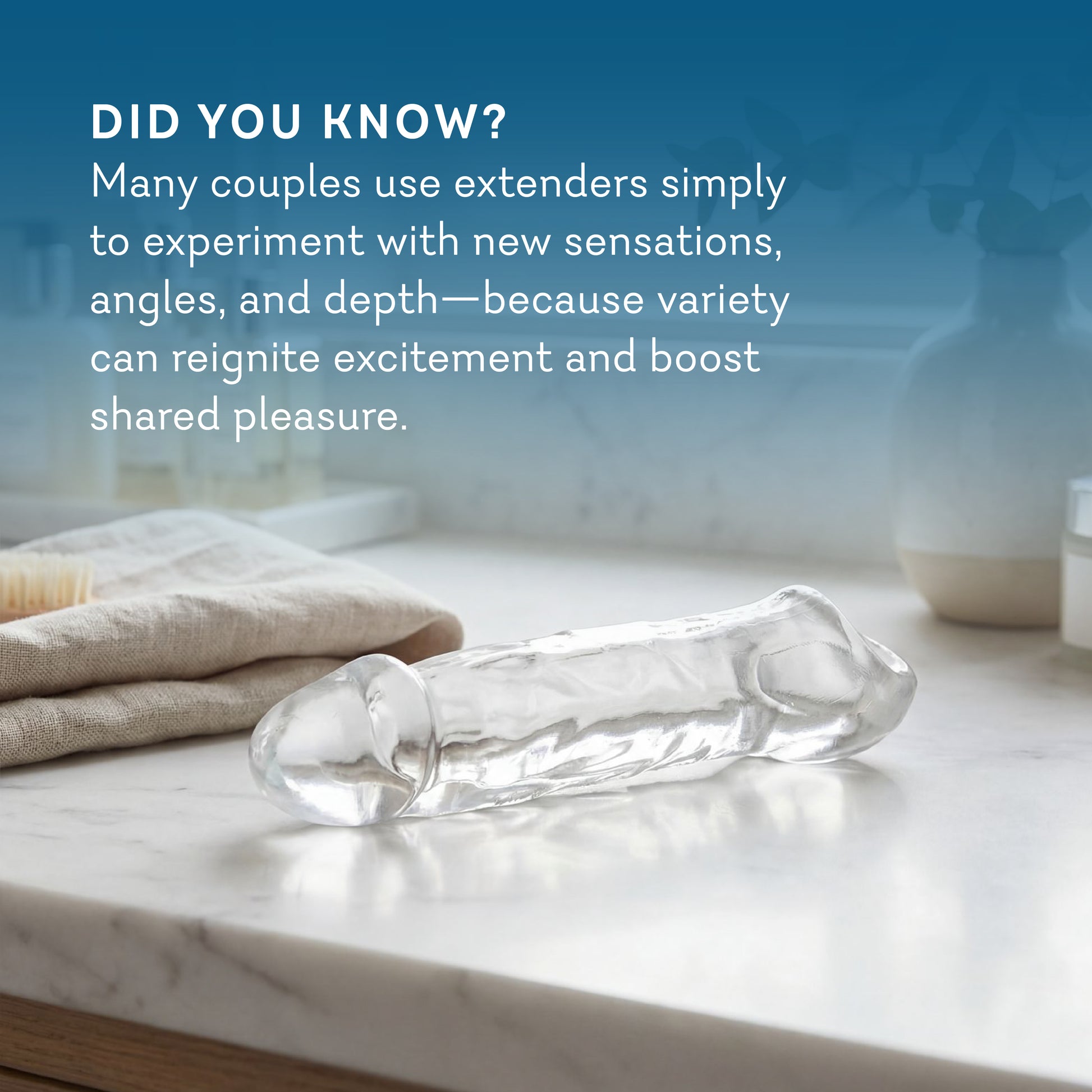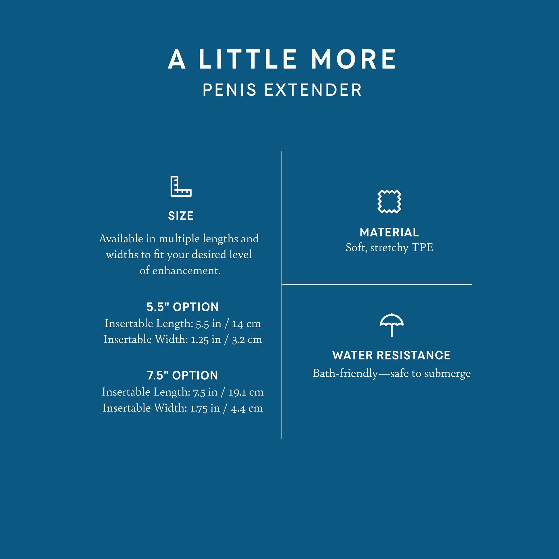 ¿Buscas un poco más? Mejora tus aventuras en la cama con este extensor de pene de 19 cm (7.5") . Hecho de TPE supersuave, "Un Poco Más" añade longitud y grosor a tu pareja para llevar las cosas al siguiente nivel. Solo aplica un poco de lubricante cremoso en el interior del juguete e introdúcelo, tirando del lazo detrás de los testículos para mantener el extensor en su lugar. Después, aplica lubricante en el exterior del extensor... ¡y disfruta!