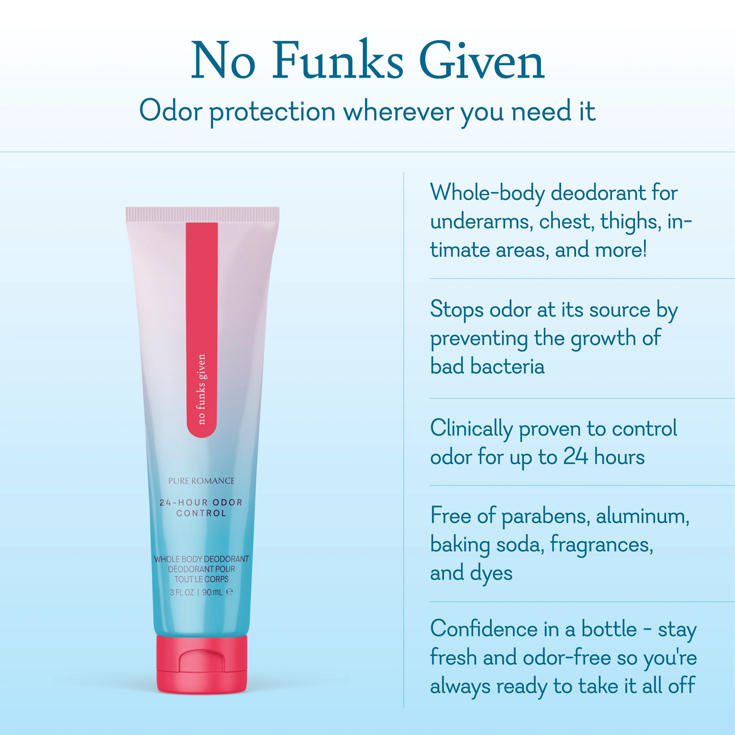 No Funks Given también es beneficioso para el microbioma. Tu piel alberga miles de millones de microorganismos, un microbioma que ayuda a proteger tu cuerpo. No Funks Given incluye citrato de plata, que ayuda a prevenir el crecimiento de bacterias malas, para detener el mal olor antes de que empiece.