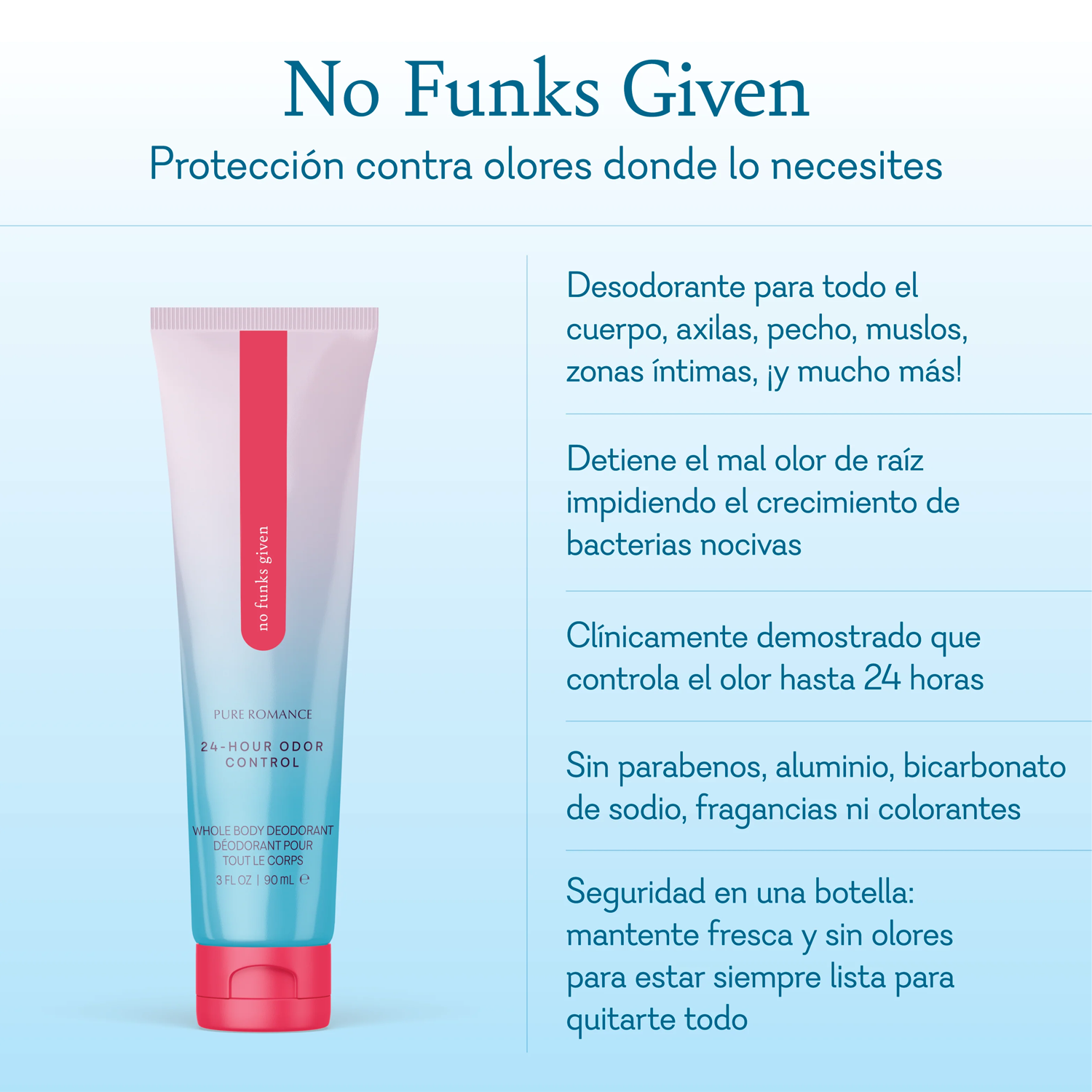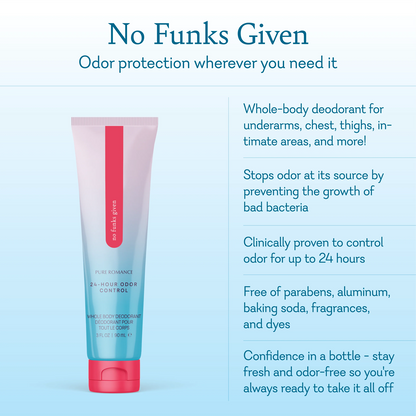 Mantente seca y sin olores con No Funks Given, un desodorante para todo el cuerpo sin parabenos, sin aluminio y sin bicarbonato de sodio. Nuestra suave fórmula en crema utiliza SymDeo® B125, un desodorante patentado que puede durar hasta 24 horas, para que puedas sentirte fresca y segura todo el día. También incluye niacinamida, que ayuda a retener la humedad, minimizar la apariencia de los poros, iluminar la piel y mantenerla firme y saludable.