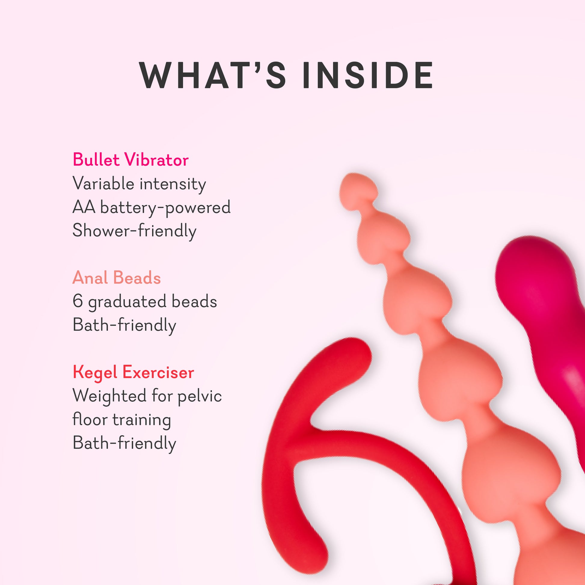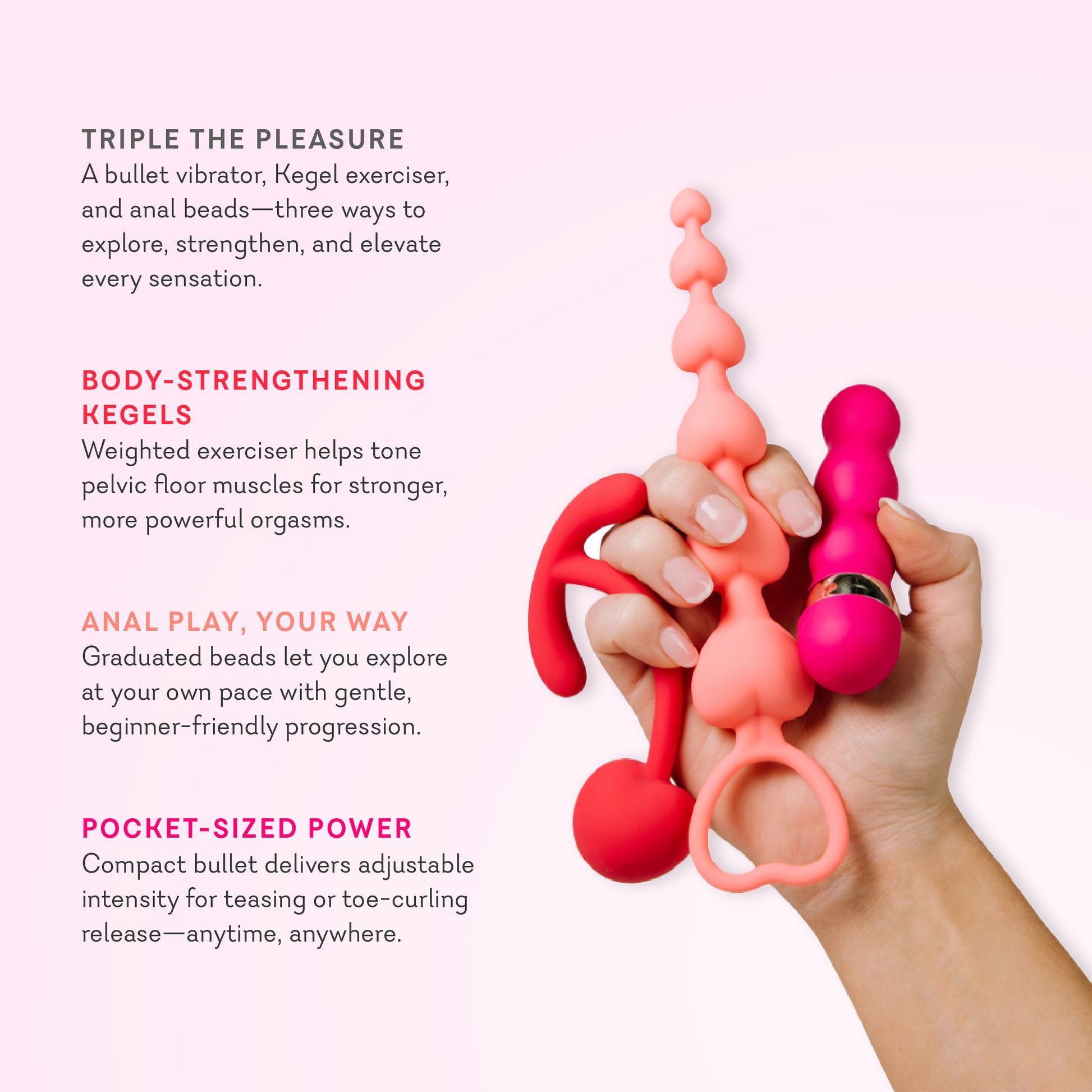 Con un vibrador tipo bala, un ejercitador de Kegel y bolas anales, este conjunto de juguetes sexuales que eleva el éxtasis es la manera perfecta de llevar tu intimidad al siguiente nivel.