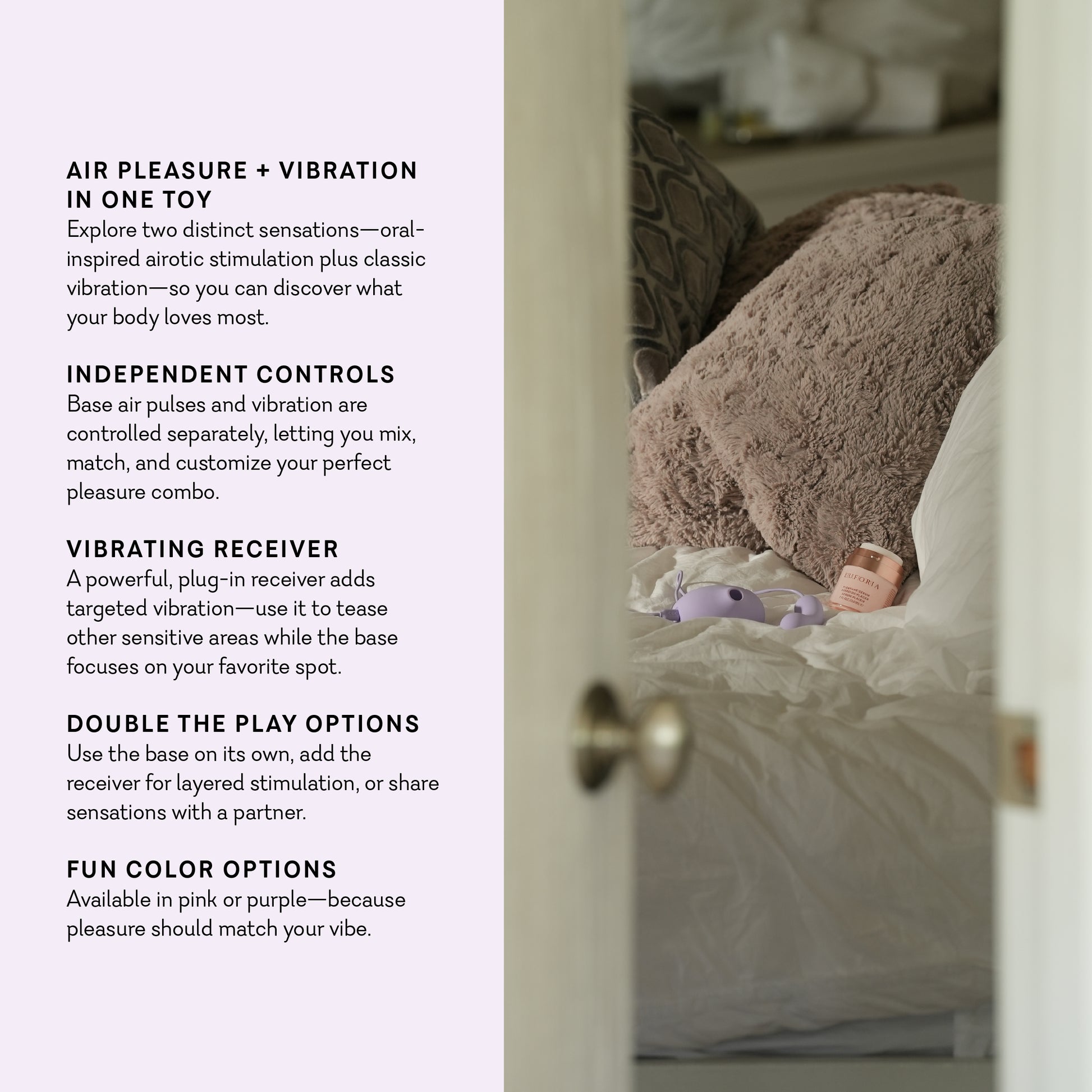 La base cuenta con tres velocidades de vibración y placer airótico, con control independiente, para que encuentres tu combinación perfecta de placer. El receptor desmontable, por su parte, ofrece tres velocidades y seis patrones rítmicos de potente vibración.