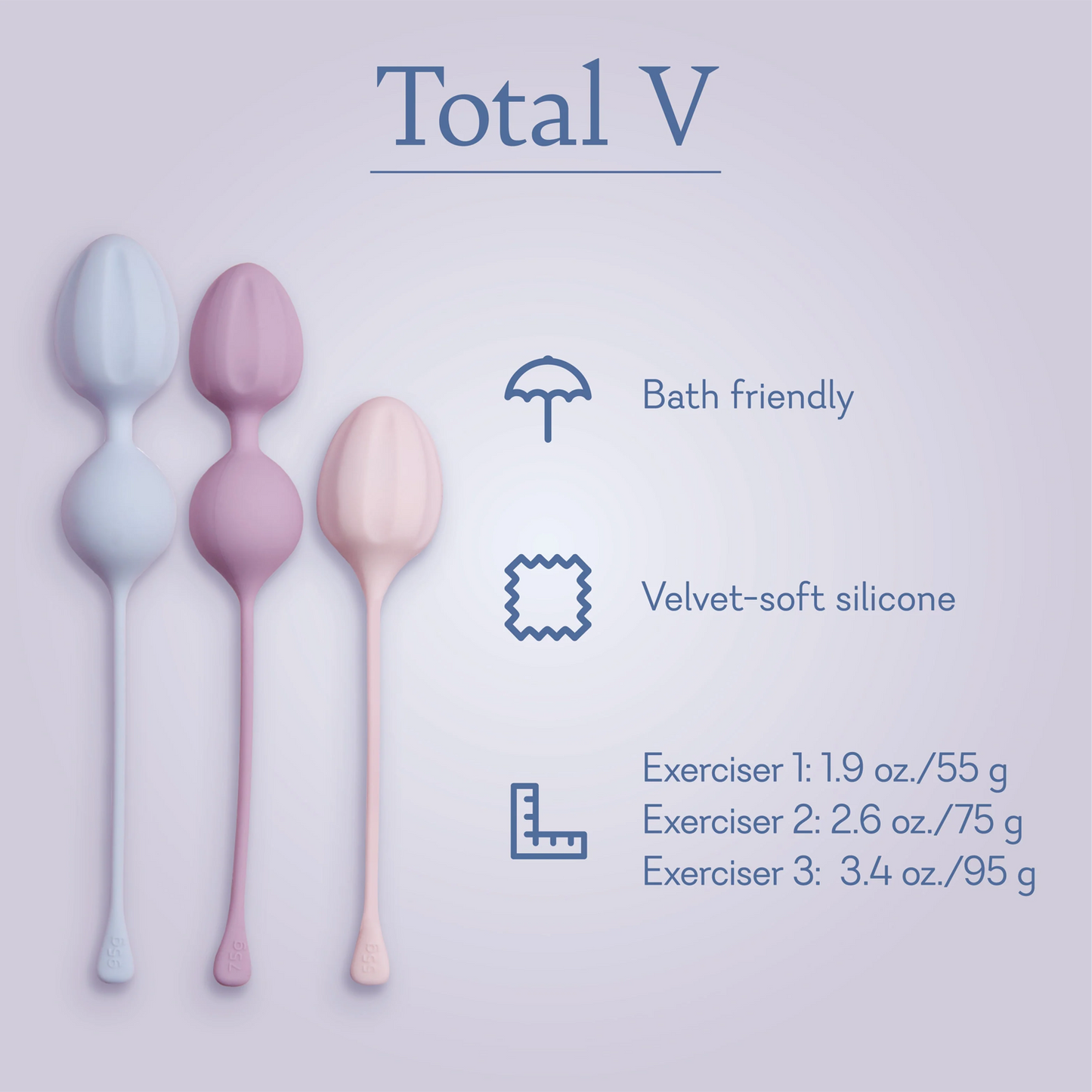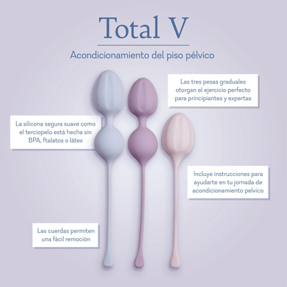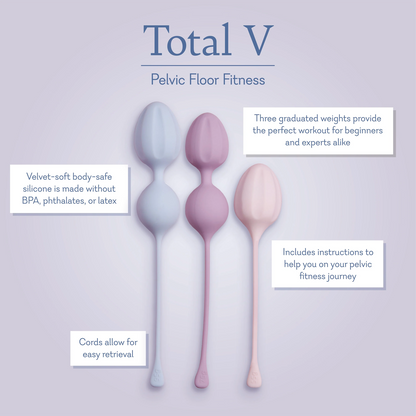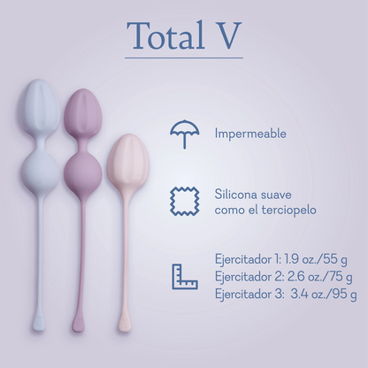Prepárate para una nueva versión de ti con Total V, un trío de ejercitadores vaginales que te ayudarán a alcanzar tus objetivos de fitness vaginal. Tanto si eres principiante como si no, cualquiera puede trabajar para fortalecer el suelo pélvico con tres pesos graduados: 55 g, 75 g y 95 g, además de una rutina diaria gratuita, rápida y sencilla, que se adapta a cualquier agenda apretada. Usa estos ejercitadores con un lubricante a base de agua para una comodidad óptima y entrena para un fitness vaginal total.