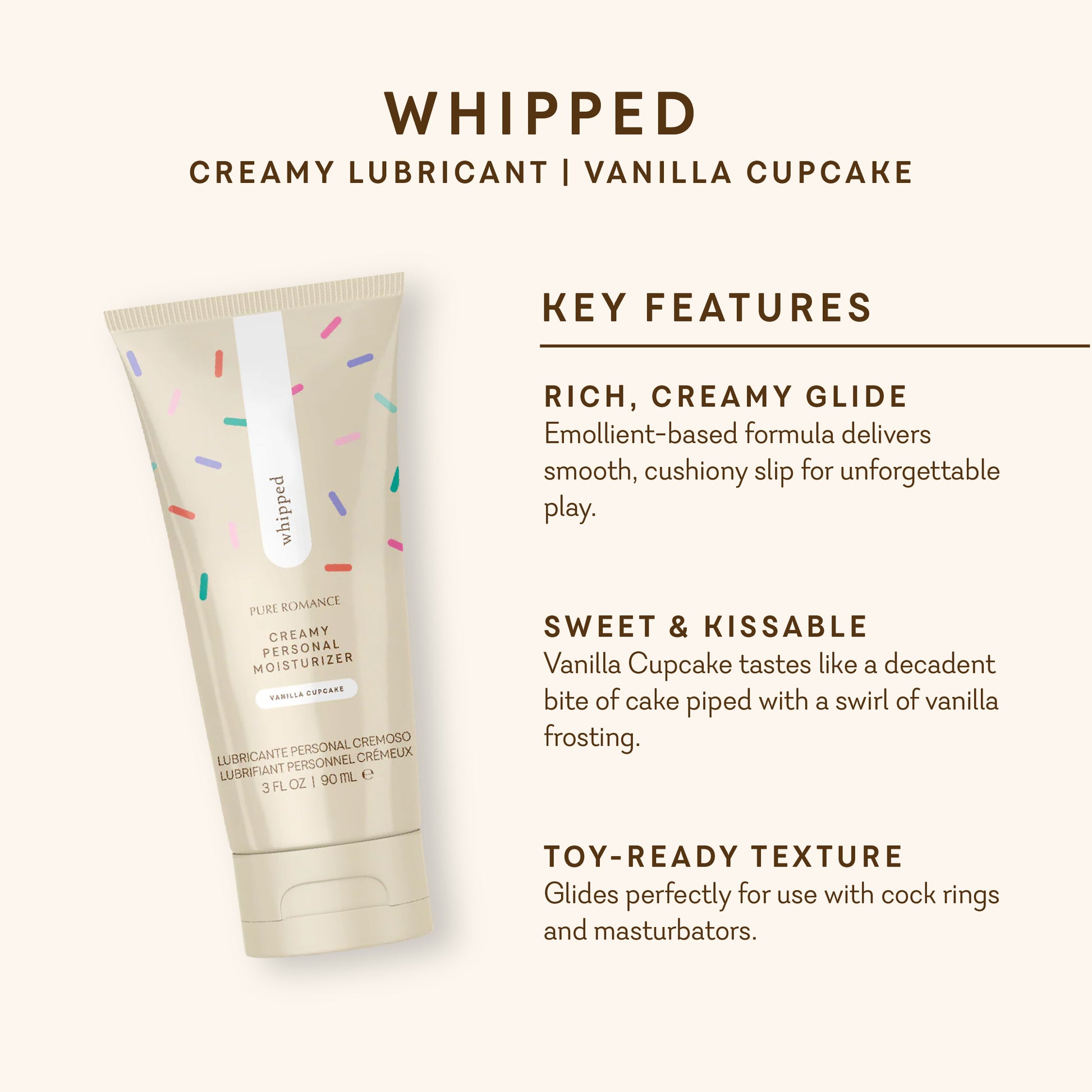 Este lubricante rico y emoliente hace que cada experiencia sea inolvidable, sin importar lo que tengas en mente. Whipped está elaborado con una mezcla de ingredientes que combinan una óptima fluidez con deliciosos sabores como el Cupcake de Vainilla, ¡un dulce capricho con un delicioso sabor a pastelito, cubierto con un toque de glaseado de vainilla! Aplícalo en el pene para complacer a tu pareja y a tu paladar, o combínalo con un anillo en C o una funda de placer.