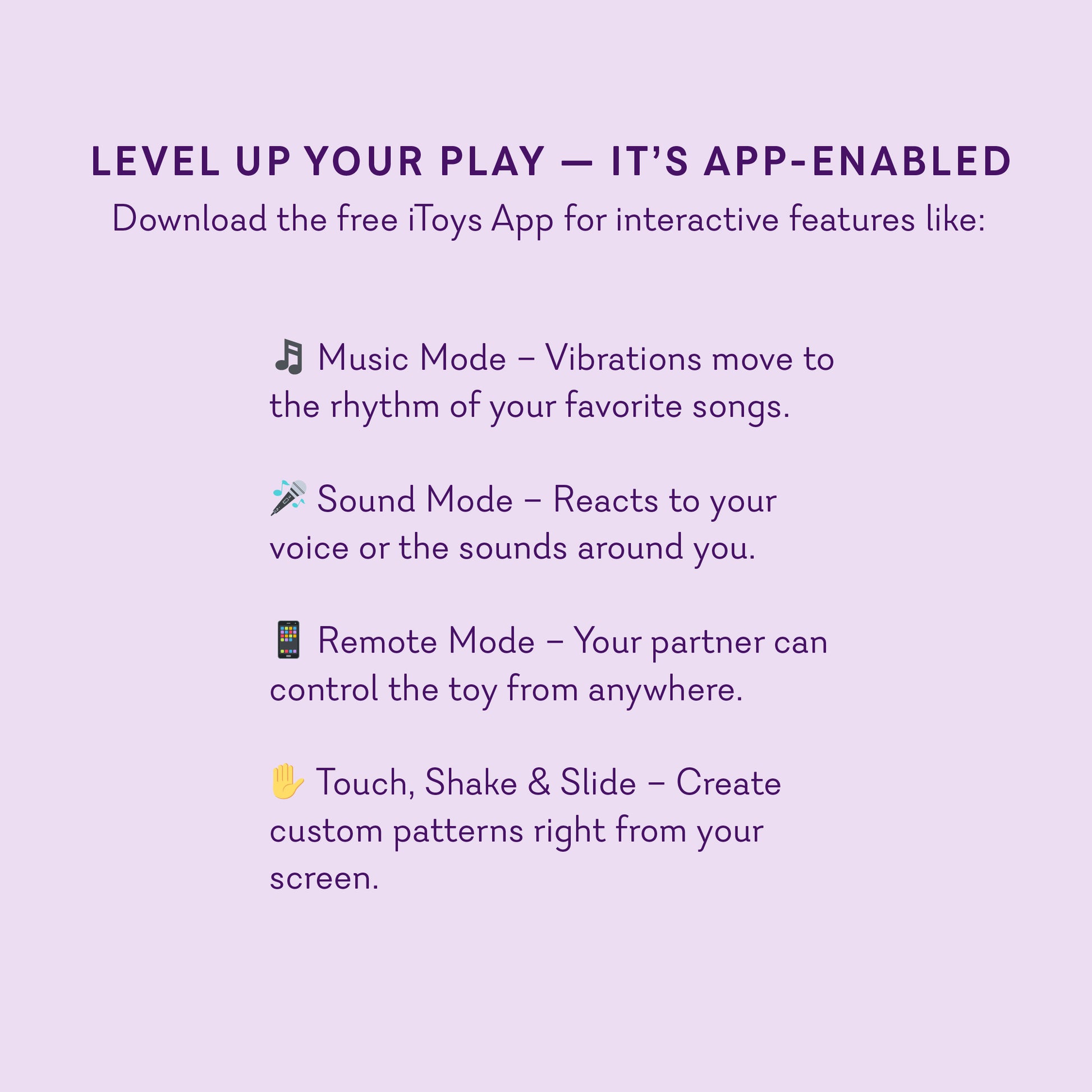 The iToys app allows you to explore multiple ways to play – from the audio-activated Sound Mode, to touch-sensitive Immersion Mode, to play-from-afar Remote Mode – so you and your partner can enjoy time together from across the room…or across the world.