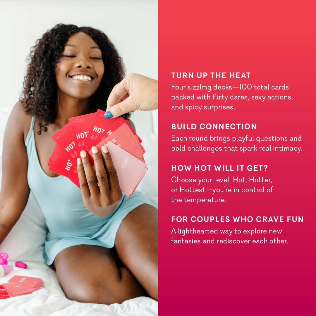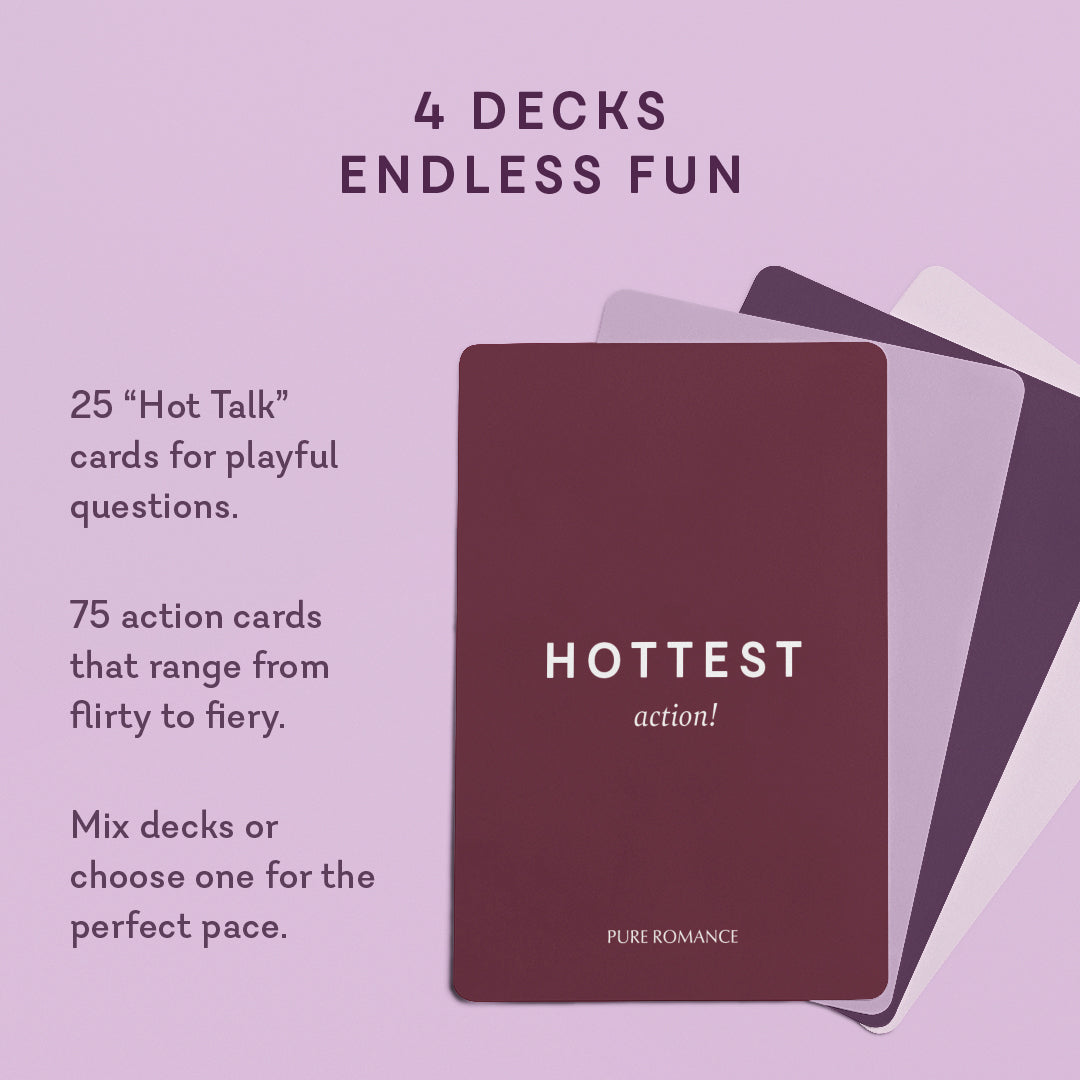 ● Four decks with 100 total cards: 25 Hot Talk cards and 75 action cards ranging from Hot to Hottest