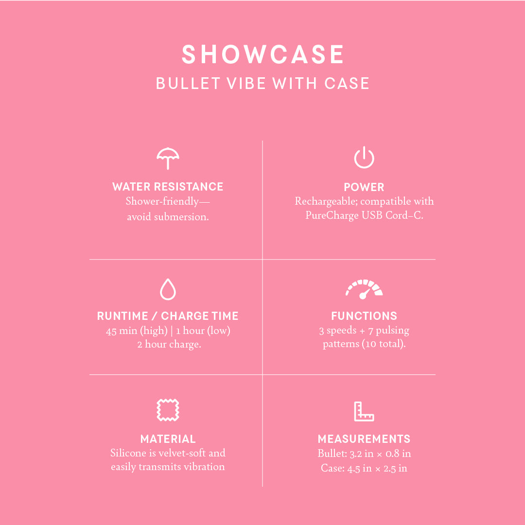 • Silicone-coated bullet with 3 vibrating speeds and 7 pulsing patterns.