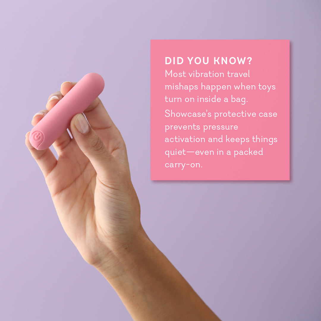 Staycay or vacay, this vibe and case combo is sure to be the star of your intimate collection. Discreet black and compact, the included case fits into your favorite bag or carry-on so your private show stays private. Plus, the mesh pocket is perfect for holding the charge cord, so you have everything you need on the go. To enjoy, add a dab of lubricant to the silicone-coated bullet for powerful vibration right where you want it, then store it in the case when you’re done!